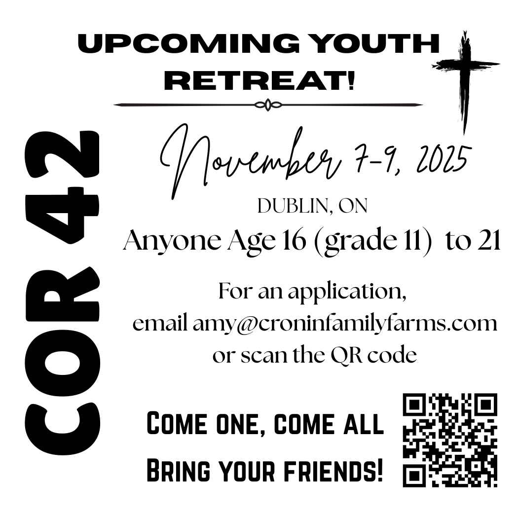 There will be a retreat in Dublin for youth aged 16 (grade 11) to 21 from November 7-9. More is on the graphic for bulletins at this link. If you have any questions please email amy@croninfamilyfarms.com.