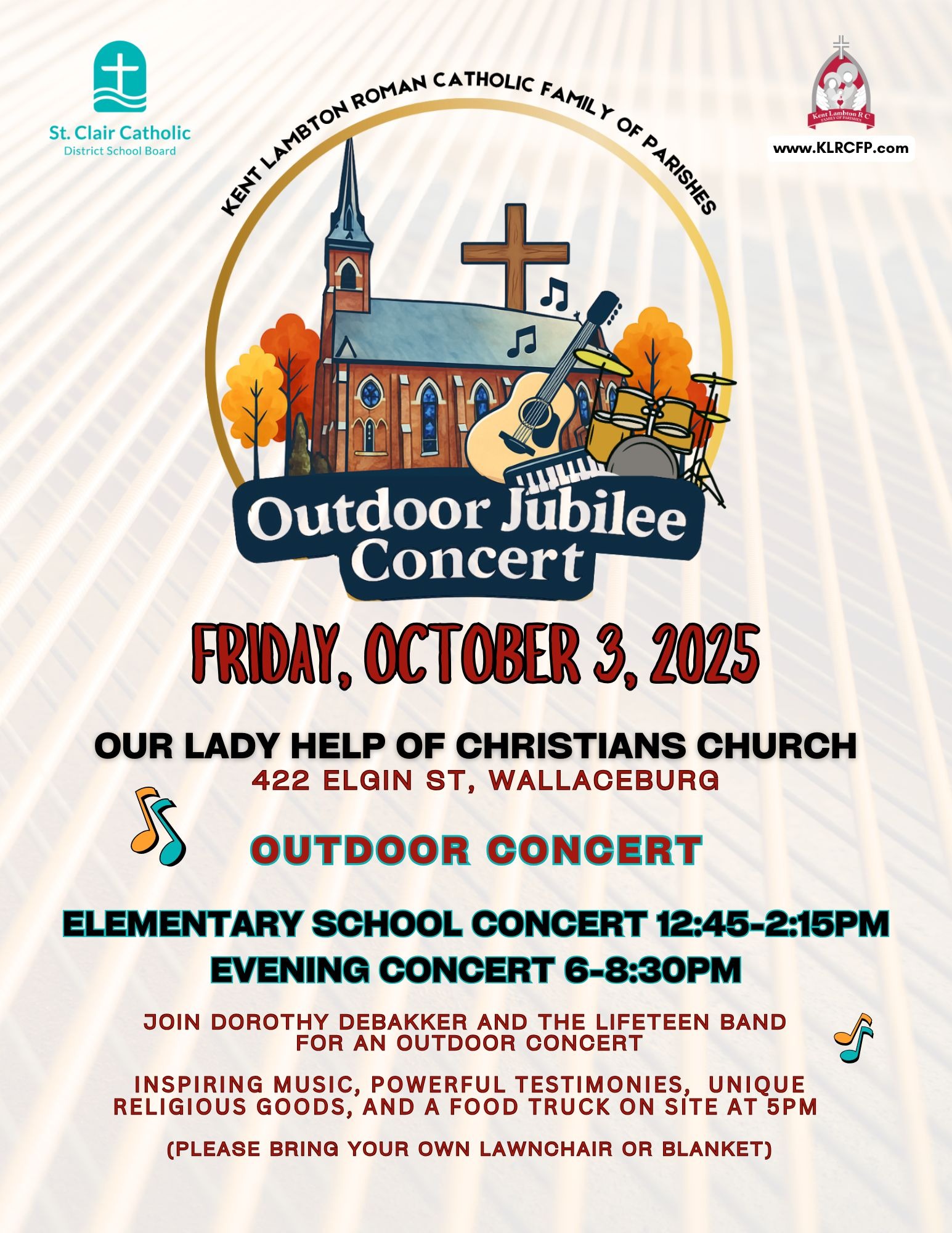 The Kent Lambton Roman Catholic Family of Parishes is hosting an outdoor Jubilee concert at Our Lady Help of Christians church in Wallaceburg (422 Elgin Street) on Friday, October 3. There is an elementary school concert from 12:45 to 2:15 and an Evening Concert from 6:00 to 8:30. More information is on a printable flyer is at this link. We are Pilgrims of Hope!