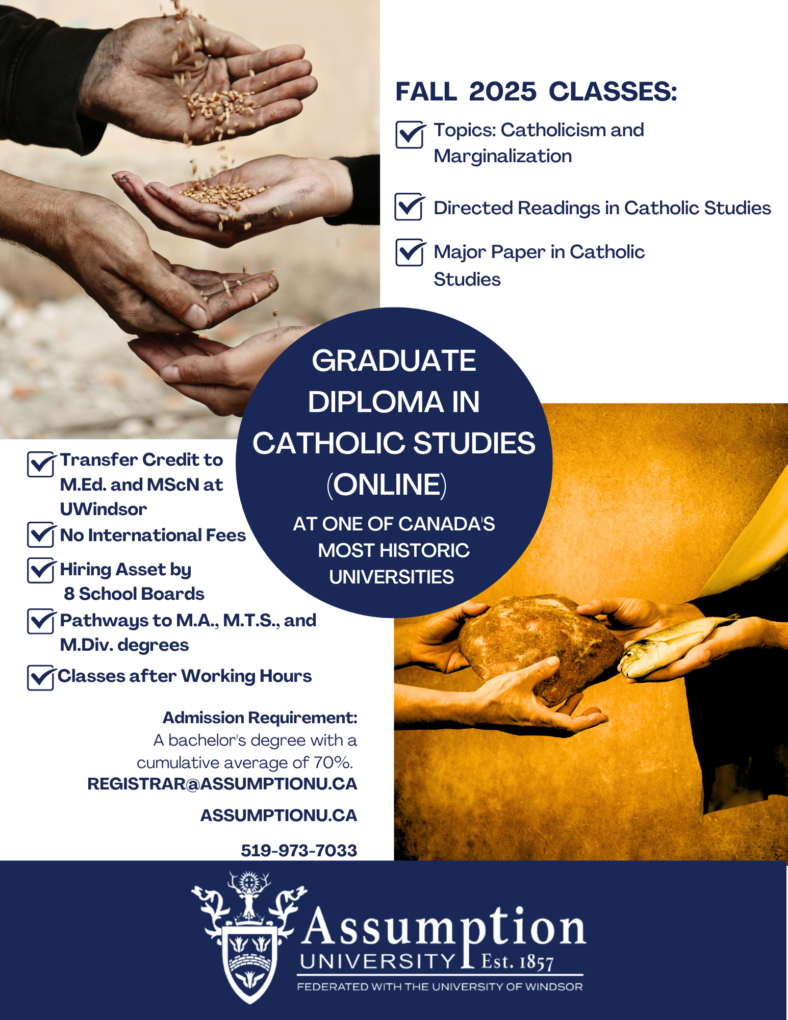 Assumption University is offering a new online and synchronous course called "Catholicism and Marginalization." It explores how the Church is trying to be more inclusive to groups often felt without a voice, such as women, the elderly, youth, and racialized and LGBTQ+ communities. Individuals can apply to take the course at this link. There are no international fees or ancillary fees at Assumption. The course meets once per week on Thursdays from 6:00-8:50 beginning September 4th. Dr. Heejung Cho will be the professor. More information is at this link